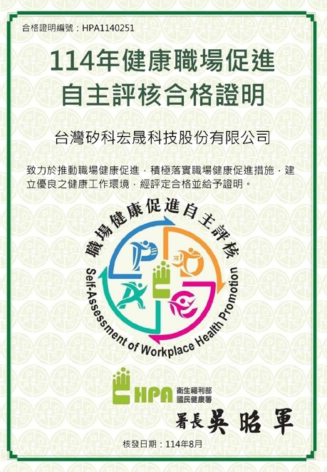 矽科宏晟 積極參與衛生福利部國民健康署推動之【職場健康促進自主評核】,經審查順利取得「合格」資格,肯定公司在本年度健康促進工作上的努力與成效,此認證不僅肯定公司健康管理與促進措施,也鼓勵持續推動健康職場計畫,透過年度自主評核檢視成效並持續優化及改善。